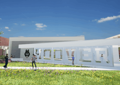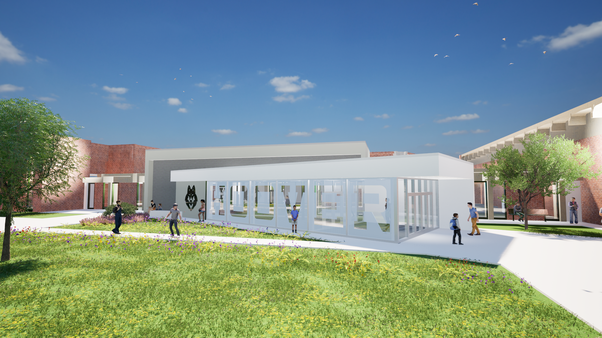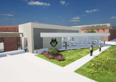 The 1,700-square-foot addition features a modern exterior defined by two monolithic forms that create a dynamic, welcoming entrance aligned with the school’s primary student access points. The use of contrasting materials and bold graphics distinguishes the new addition from the existing building, giving it a strong visual identity that will provide clear wayfinding for all visitors attending academic and athletic events.